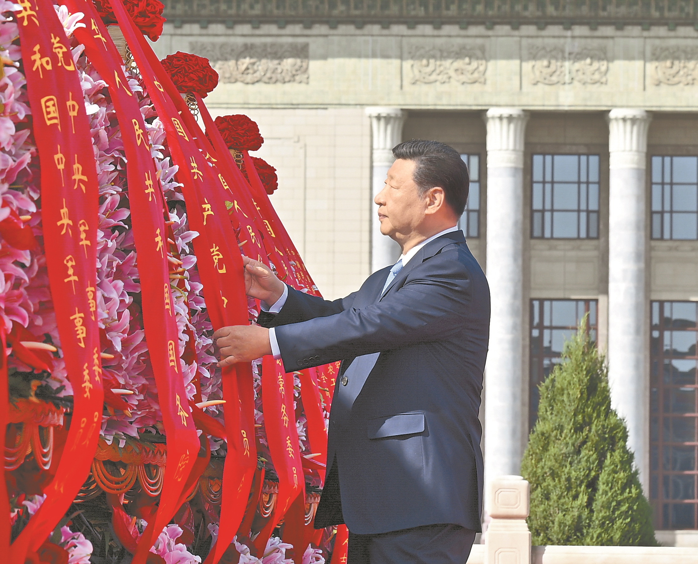 习近平迈步上前,仔细整理花篮缎带。随后,习近平等党和国家领导人缓步绕行,瞻仰人民英雄纪念碑。