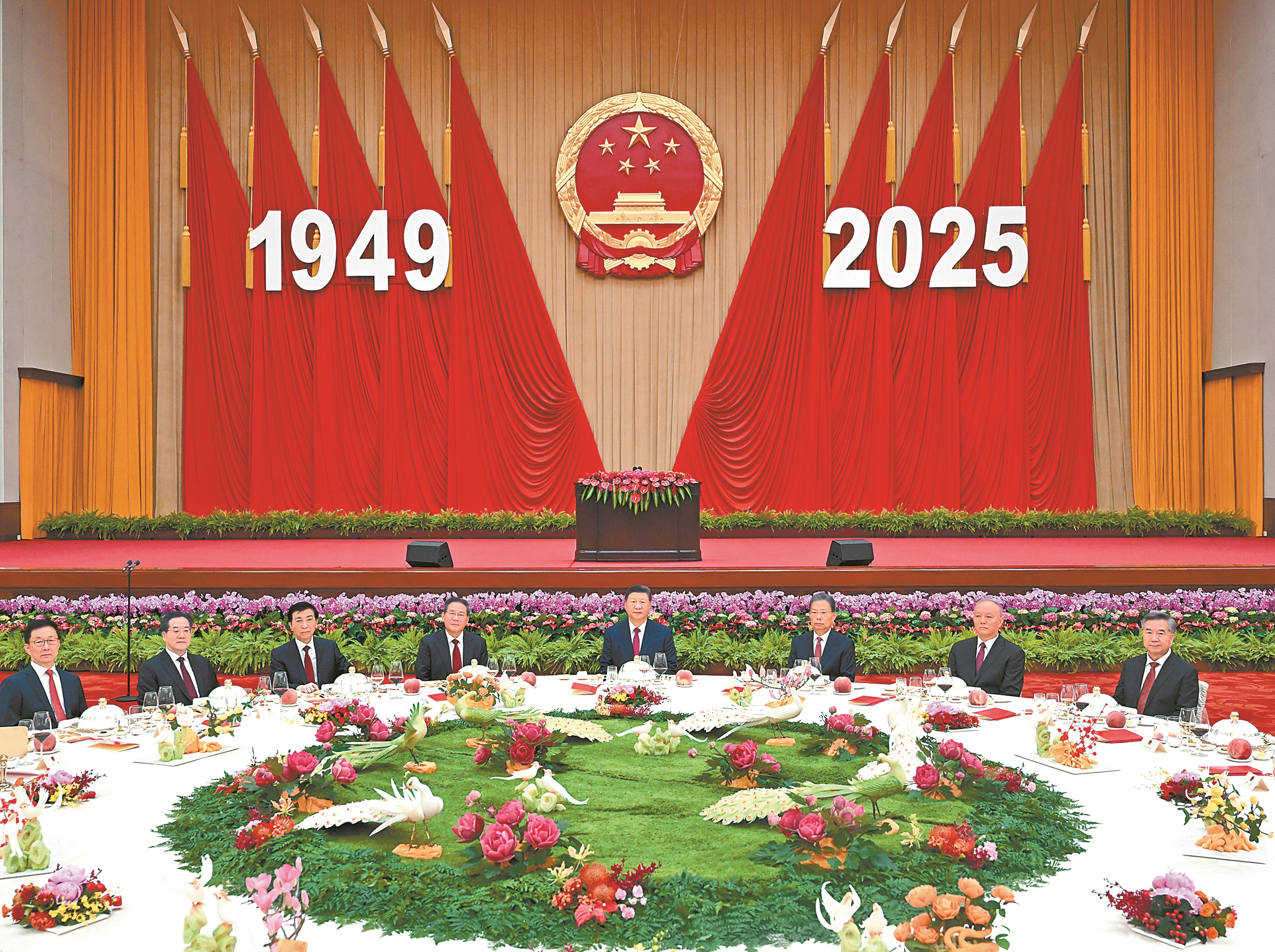 在欢快的乐曲声中,中外宾朋举杯共贺中华人民共和国成立76周年,祝福中国繁荣昌盛、人民幸福安康,祝愿中国人民和世界各国人民友谊长存。