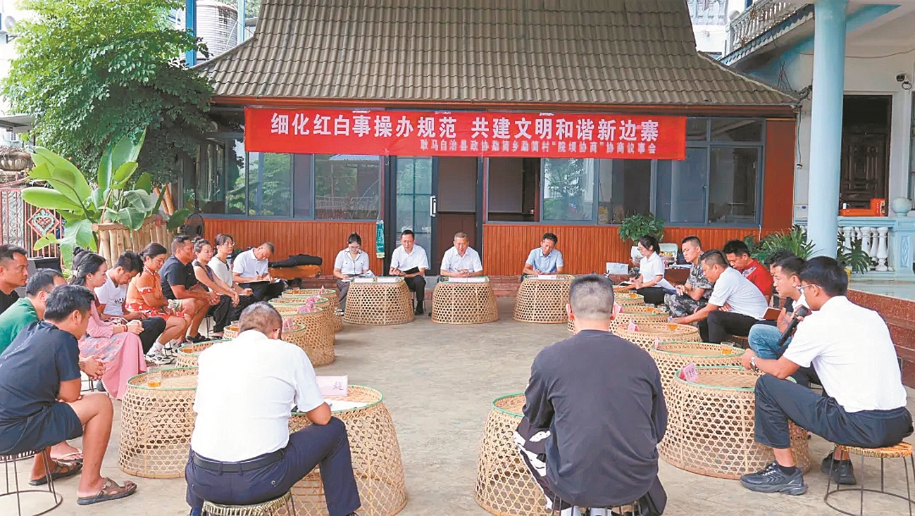 日前,耿马傣族佤族自治县政协在该县勐简乡勐简村大军赛村民小组召开以“细化红白事操办规范 共建文明和谐新边寨”为议题的院坝协商议事会议。