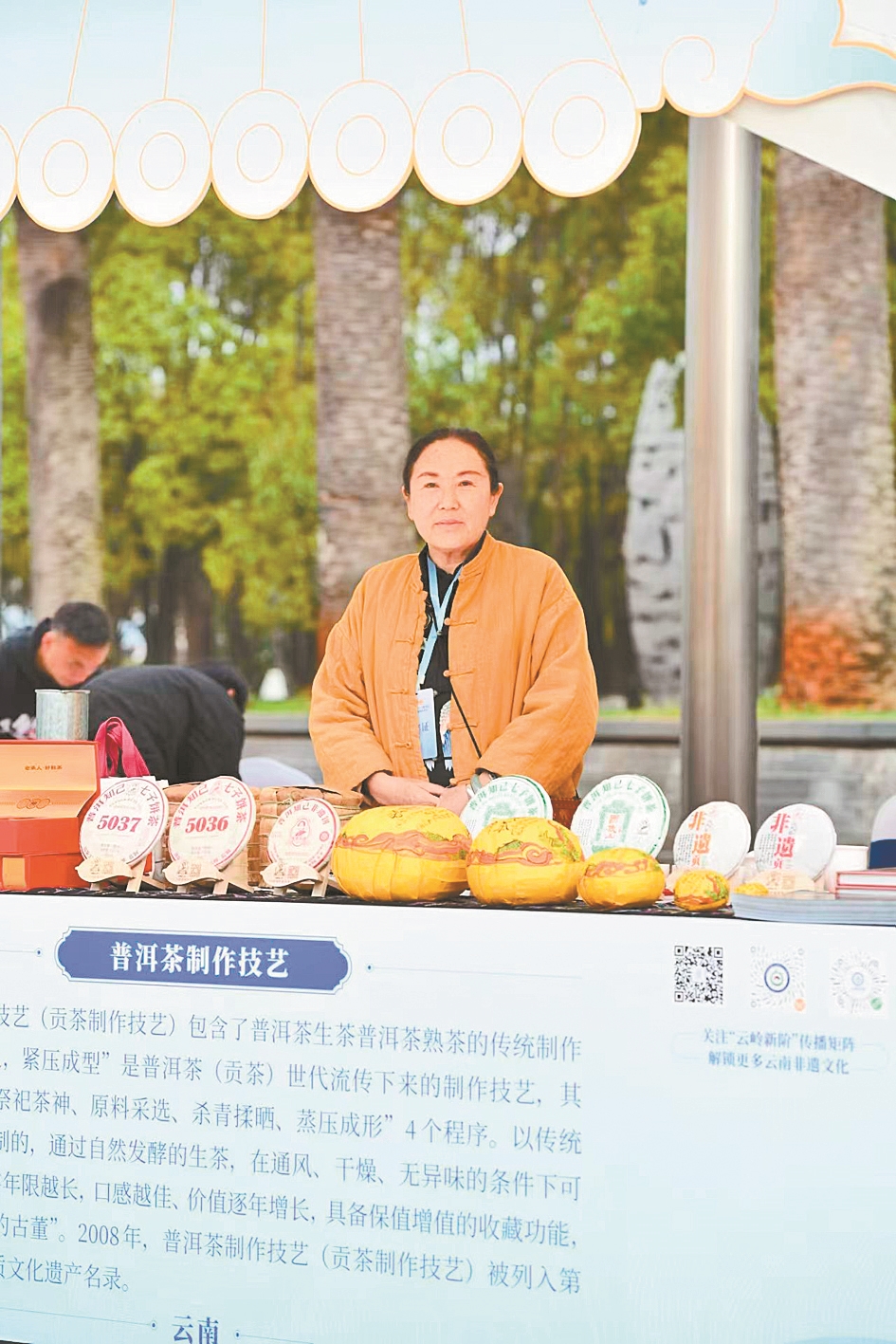 展位后方,一个忙碌的身影格外引人注目——她就是普洱市政协委员、普洱贡茶制作技艺省级非遗代表性传承人赵华琼。她一边热情招呼来宾,一边耐心解答有关普洱茶制作工艺的各类问题,引得众人纷纷驻足聆听。